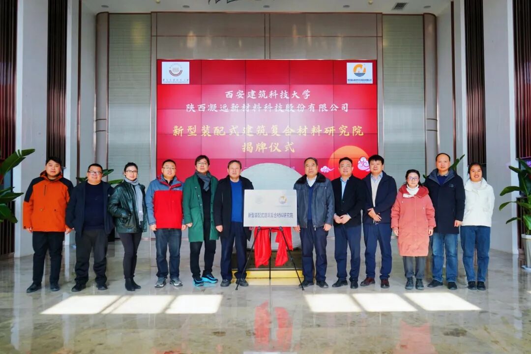 材料学院党委书记段锋代表学院对新型装配式建筑复合材料研究院的成立表示祝贺,他表示研究院未来将双方的优势结合起来,为学生提供更加全面、深入的实践机会,凝远新材作为一家优秀的民营企业,积极履行了民营企业社会责任,吸纳更多高校毕业生,为高校毕业生们提供了更好的职业发展机会,推动了社会就业工作的稳定发展。 材料学院副院长魏剑从学院概况、人才培养、科研平台、技术成果等方面做了概括介绍。他指出,相信通过以合作共建研究院为契机,更进一步加深学院与企业的合作,定能实现校企双赢。 土木学院副院长黄炜表示,希望校企双方本着“资源共享、优势互补、合作双赢、共同发展”的原则,加强在固废综合利用、建筑工业化、新型建筑材料、绿色建筑技术等相关领域的研究,加强高水平人才培养、培训与人员引进,创建更高水平的产学研合作平台,共同维护研究院的良好运转。 集团副总经理刘振丰表示,共建研究院是校企协同创新进行“产学研”合作的重要举措。未来,双方将进一步在科技研发、成果转化、人才培养等方面开展全方位合作,把协议内容落到实处。 双方领导在凝远新材办公楼共同为“新型装配式建筑复合材料研究院”揭牌、合影留念。 此次揭牌交流,促进凝远新材与西安建科大之间建立了长期、稳定、可持续发展的产学研合作伙伴关系,实现了资源共享与优化配置。
